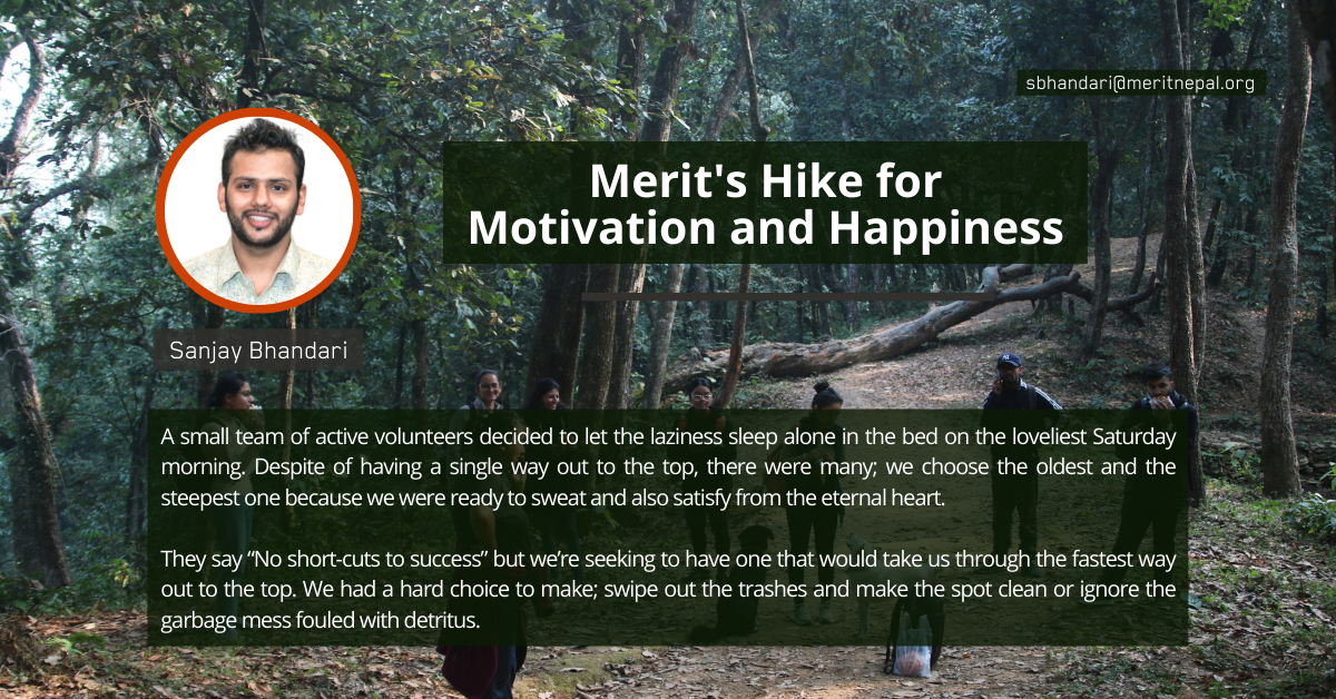 2000 hrs. and the notification pop up on the small AMOLED display “Sooner the Better”. That sentence was the last among other itinerary for the Hike starting in next 11 hrs. That was a plan made soon after an intra-team poll casted for the initiation of Merit’s Hike for Motivation and Happiness (MHMH) program by the core-team of Merit Pokhara. Out of all, only 11 of us became able to break-up with bed that dawn and two of the 11 were Misty and Jimmy, the heroes to survive horrors of their own street hurdles. We were destined to the newly build Lord Shiva’s Statue on top of Pumdi-Bhumdi hill enroute World Peace Pagoda. Sight-seeing wasn’t just the idea but to establish a healthy relation among our new and existing team members and enjoy the exploration of the frequently visited route by the lake side. They say “No short-cuts to success” but we’re seeking to have one that would take us through the fastest way out to the top. When we’ve a slight view of the mesmerizing Lake, who doesn’t want to view the full-size at first! The moment we crossed the forest and made it to the World Peace pagoda premises, we even got determined to make it higher; to the top of Pumdi-Bhumdi but then came a situation.