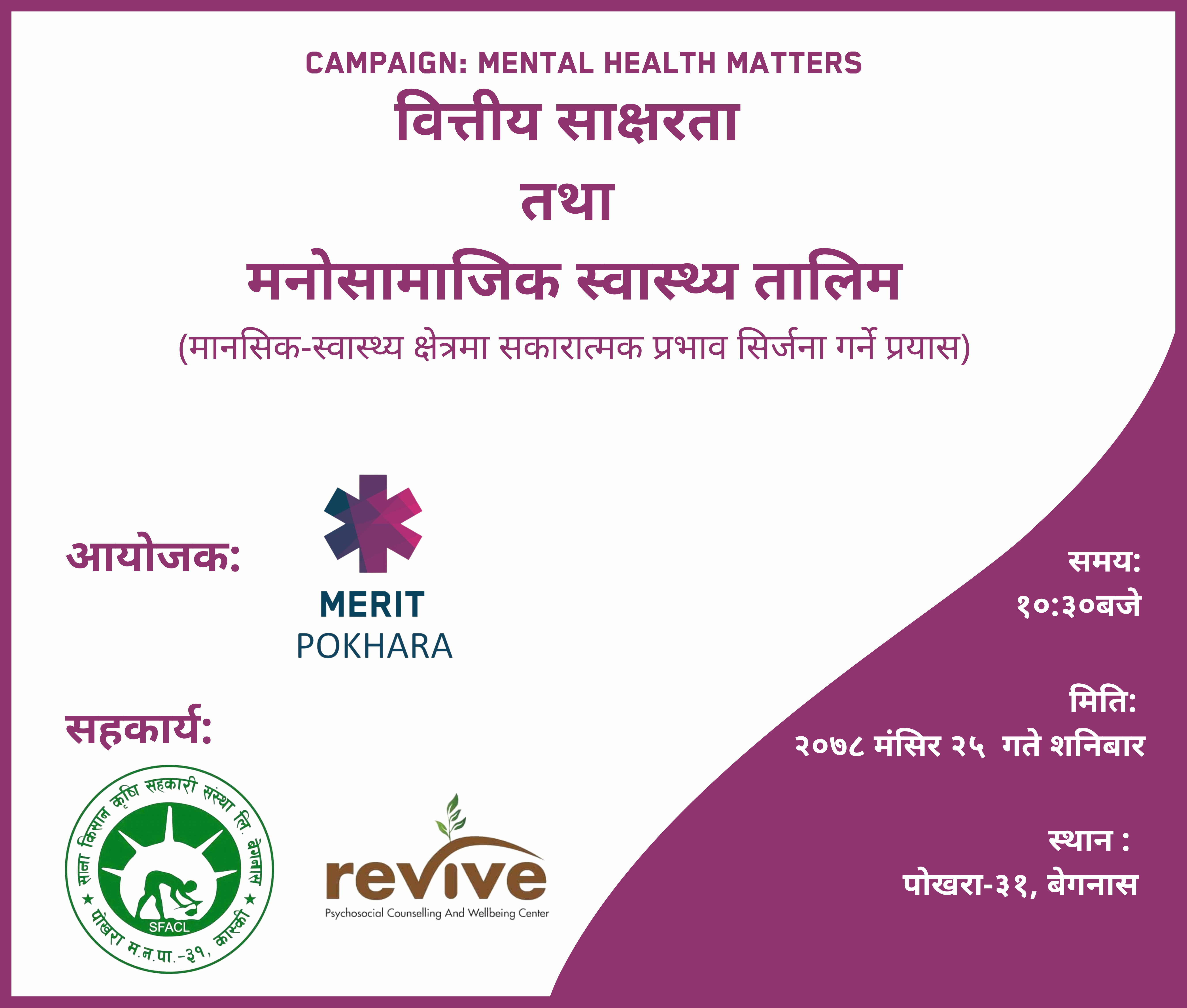 Mental health is a key part of our successful life and our overall well-being. There is no health without mental health. It is well-known that mental health is a sensitive topic However, it is rarely prioritized to physical health. Even in 21st century, there is still a stigma about mental health in most of the communities of Nepal and South Asia. People hesitate to speak about their problems whil